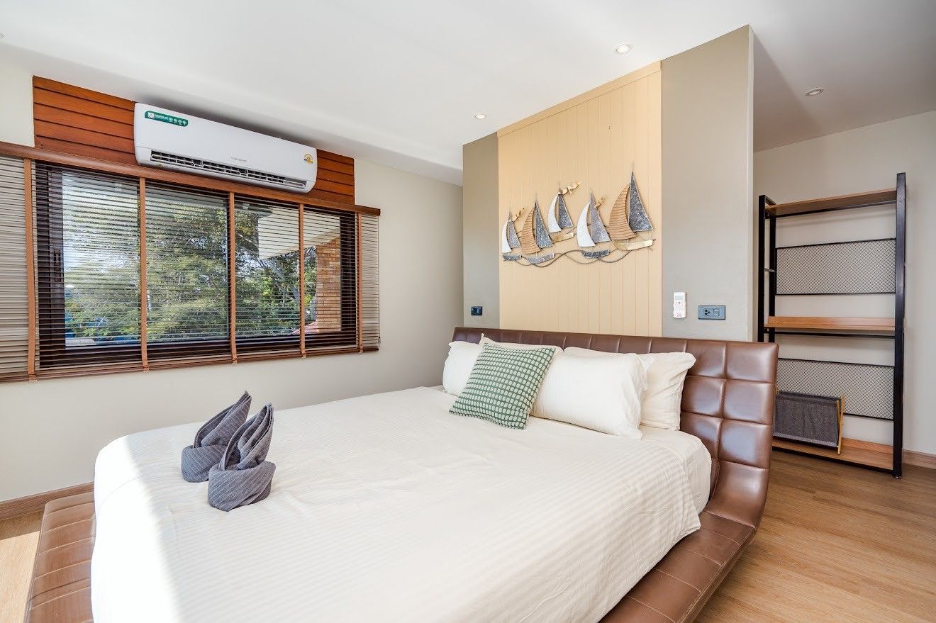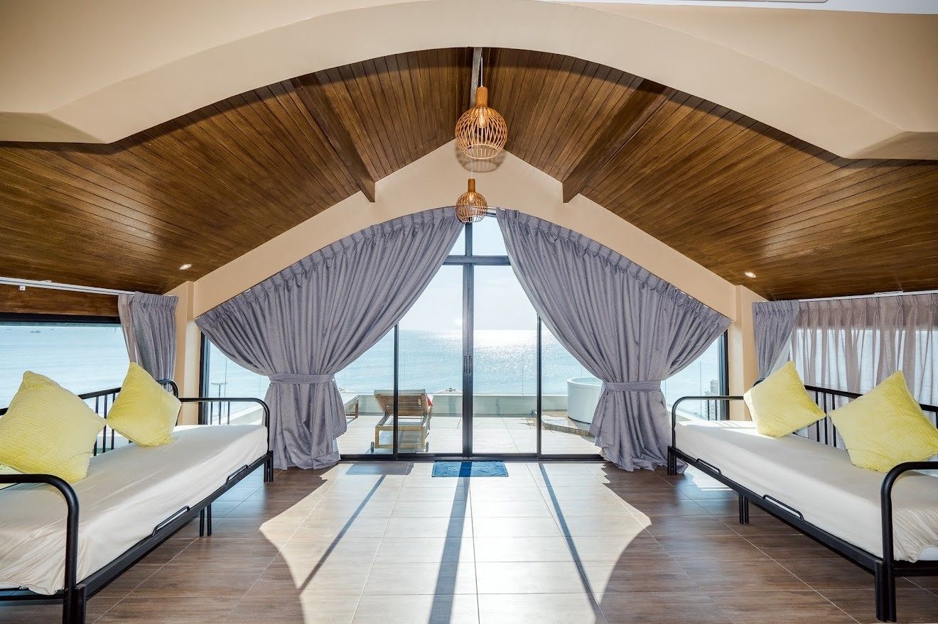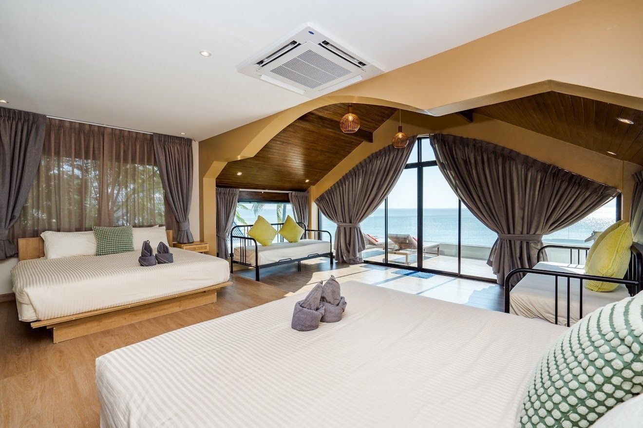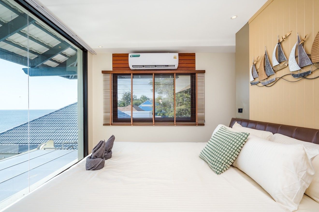 A sprawling 6-bedroom beachfront villa on Bang Kaet Beach, Cha-Am, built for large groups that want the full package. Beach Mood VI sleeps up to 25 guests across six en-suite bedrooms with sea-view rooms on upper floors. The private pool measures 7×8 metres with an 8-metre water slide, complemented by a pool table, ping-pong table, karaoke system, and BBQ grill. Complimentary equipment includes a SUP board, kayak, charcoal, ice, and drinking water. Pets are welcome, and parking for 8–10 cars is available on-site.