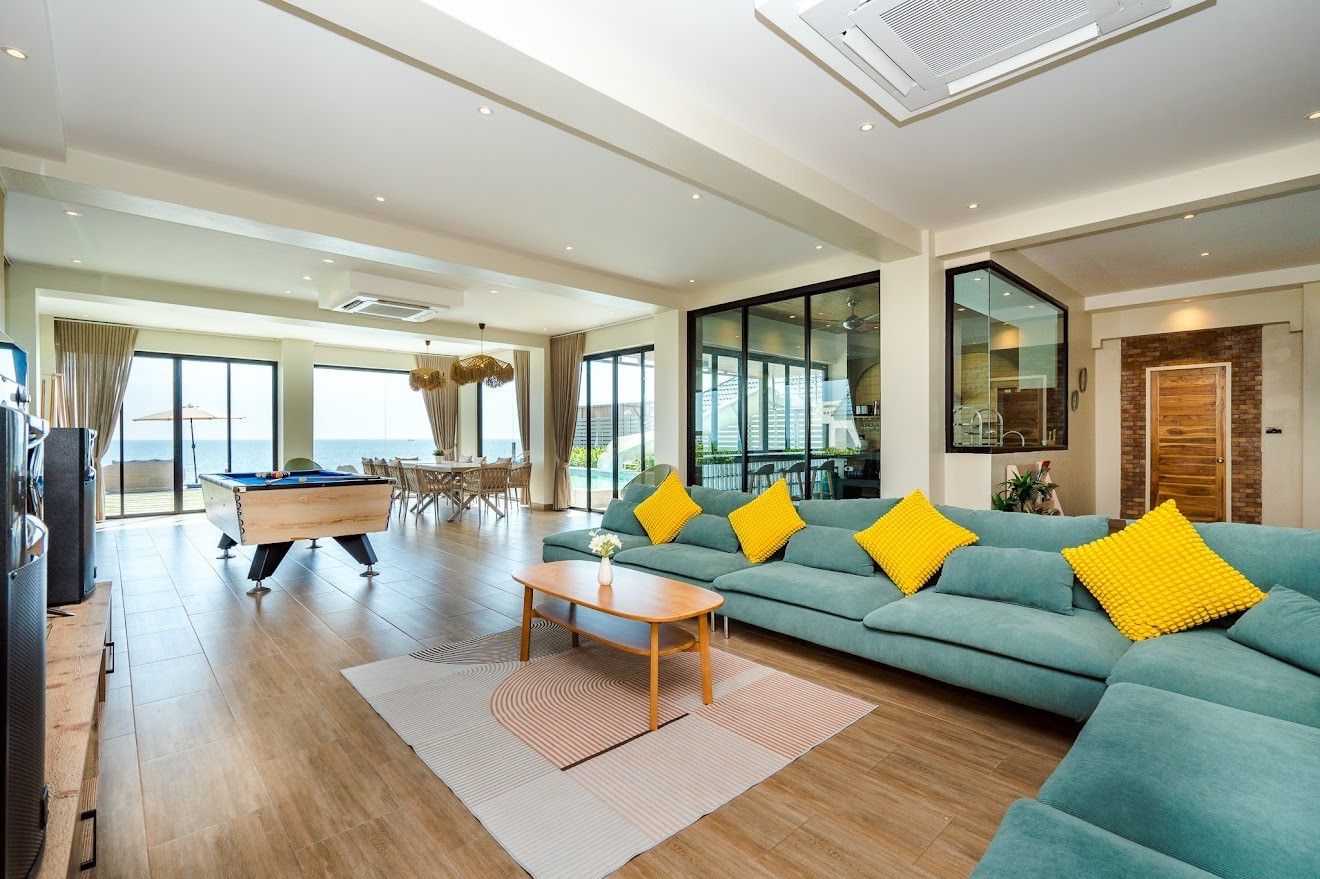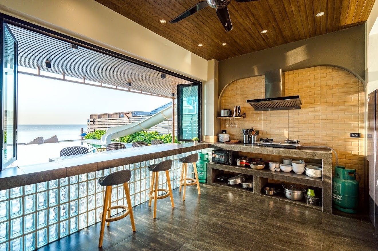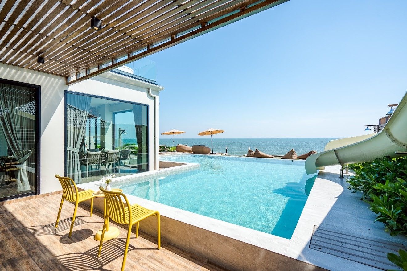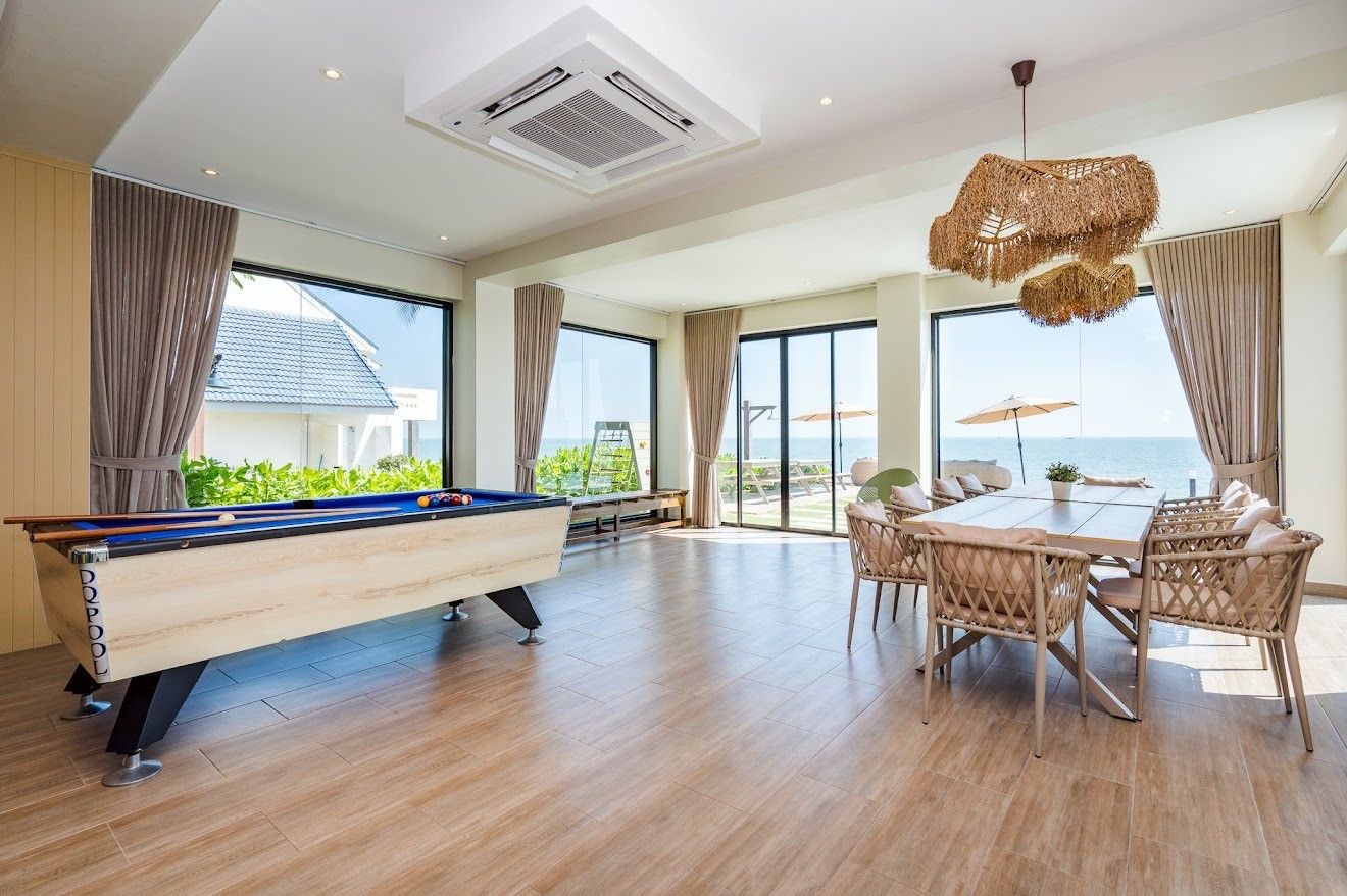 The villa comes with private pool, beachfront access, karaoke, BBQ grill, pool table, water slide, Wi-Fi, a fully equipped kitchen. There are 15 amenities in total. See the full list in the amenities section above.