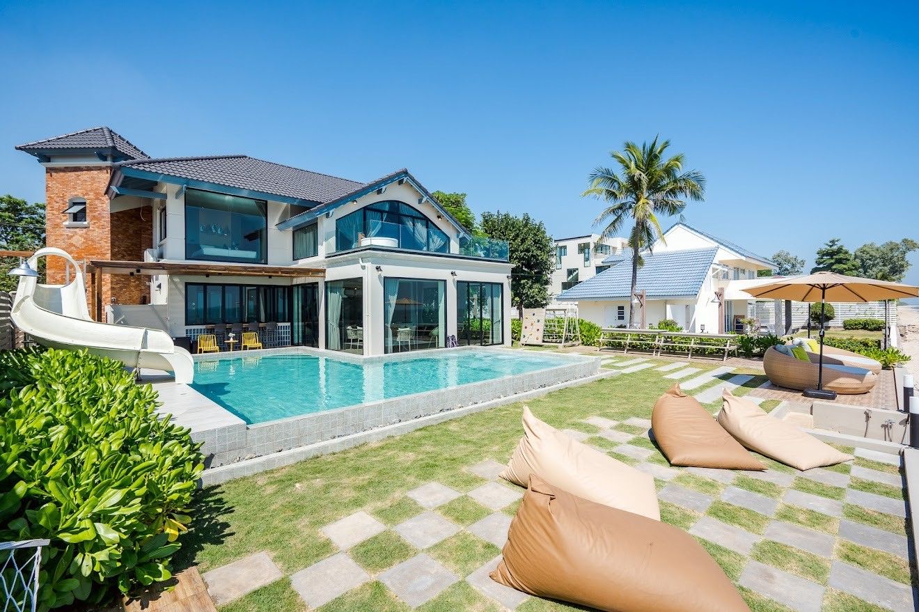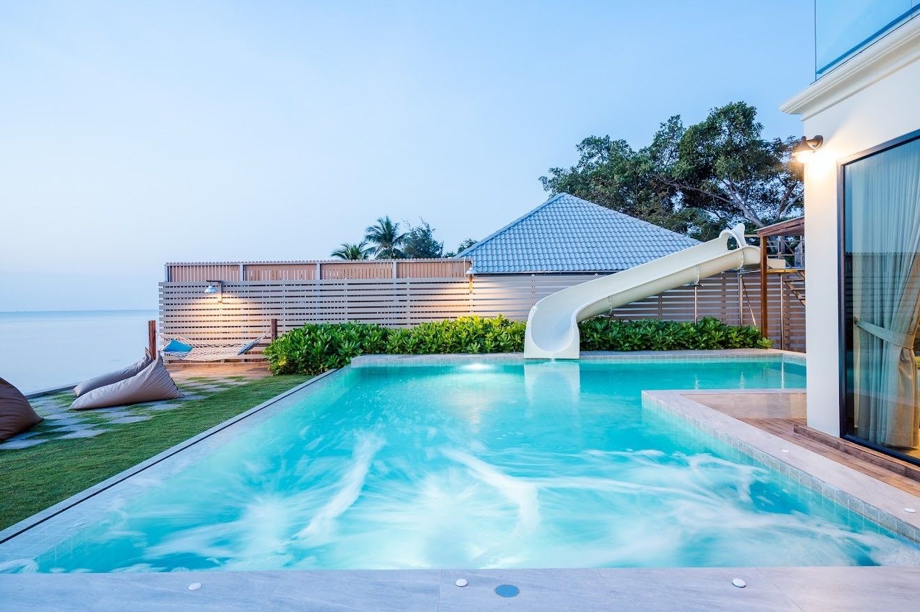 Beachfront pool with 8m water slide, ping-pong, karaoke — private beach.