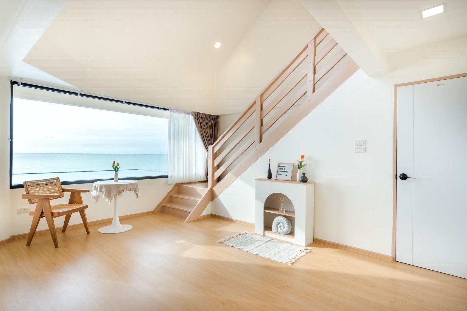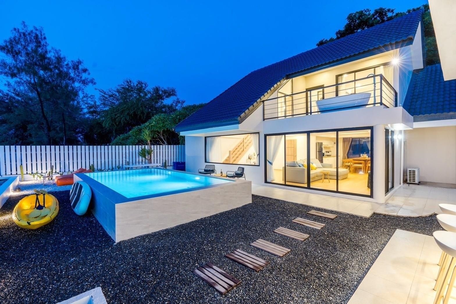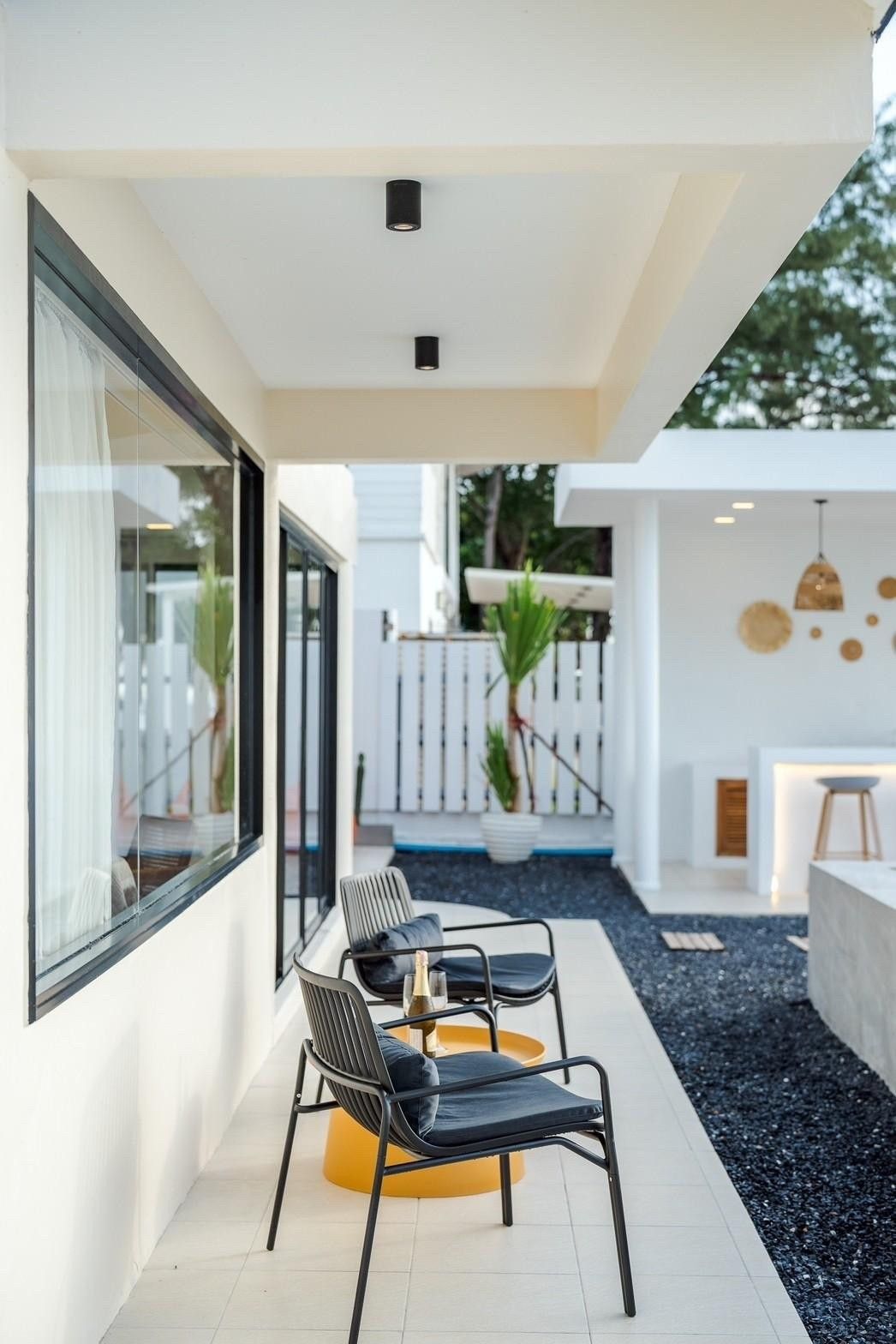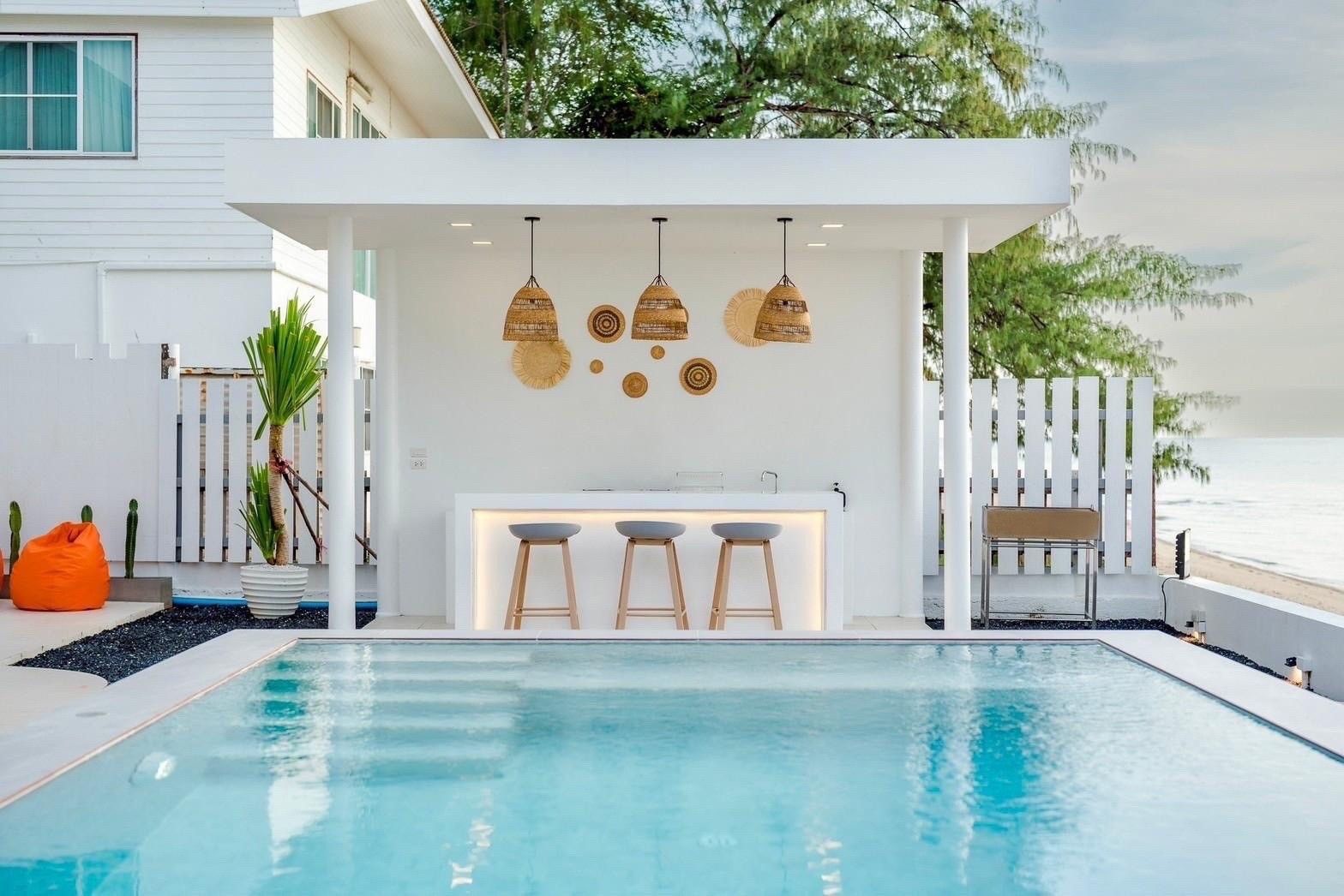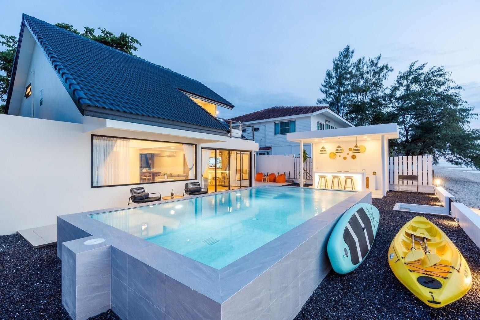 A newly opened beachfront villa on the Cha-Am coast, Costa IV blends English, Balinese, and minimalist design into a truly photogenic retreat. Four bedrooms and three bathrooms are arranged around a private pool with uninterrupted 180-degree sea views, and the standout glass-roof bathroom is unlike anything else in the area. Complimentary SUP board, kayak, ice, water, and BBQ charcoal are included — along with a welcome snack set. Karaoke, a 55-inch Smart TV, and both an indoor and outdoor kitchen make it equally suited to relaxed family stays or lively group getaways.