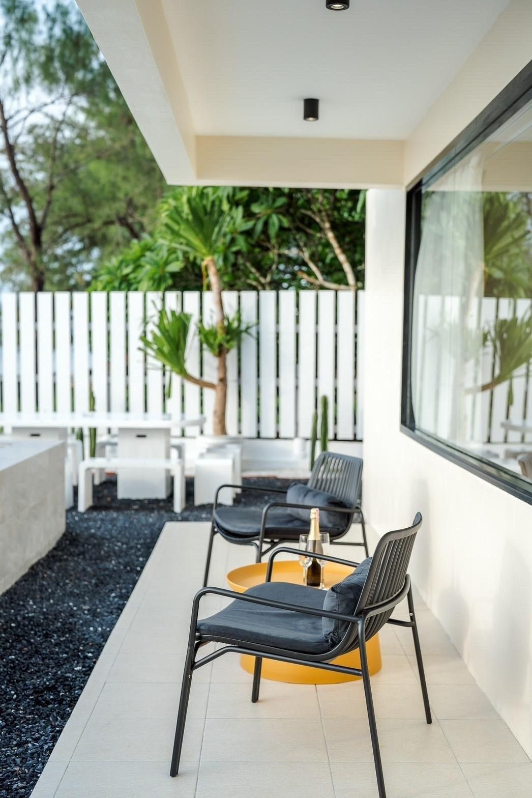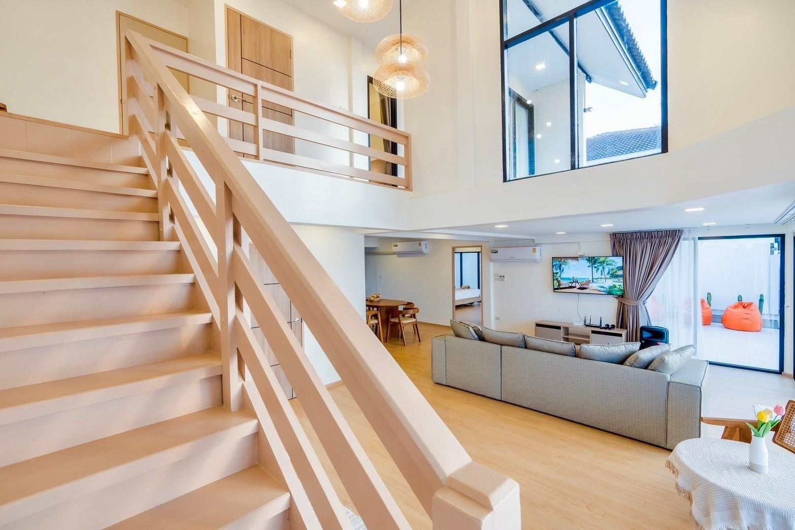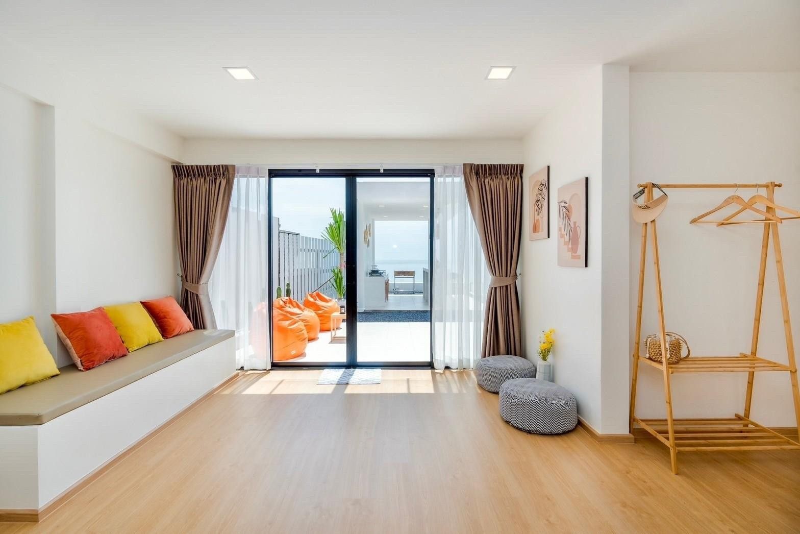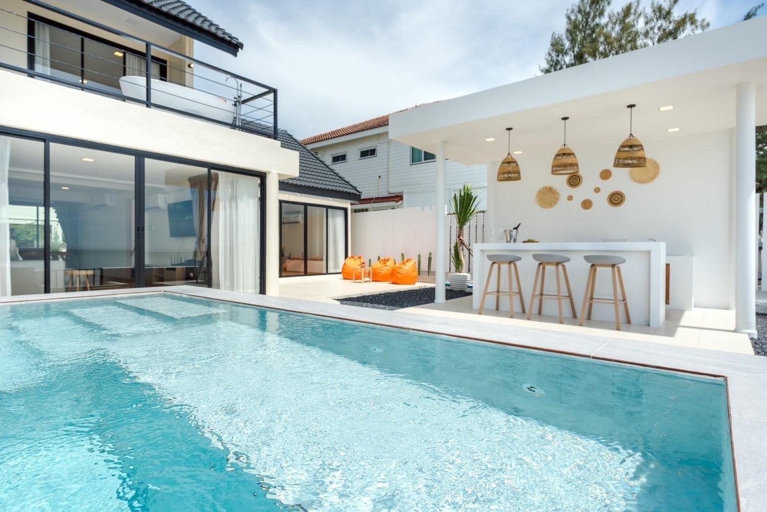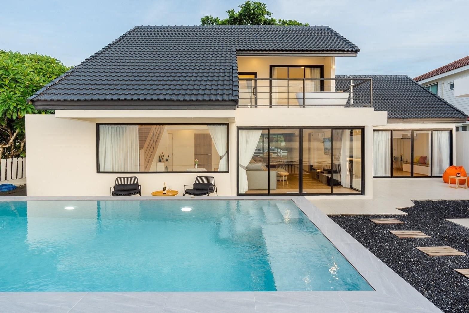 A newly opened beachfront villa on the Cha-Am coast, Costa IV blends English, Balinese, and minimalist design into a truly photogenic retreat. Four bedrooms and three bathrooms are arranged around a private pool with uninterrupted 180-degree sea views, and the standout glass-roof bathroom is unlike anything else in the area. Complimentary SUP board, kayak, ice, water, and BBQ charcoal are included — along with a welcome snack set. Karaoke, a 55-inch Smart TV, and both an indoor and outdoor kitchen make it equally suited to relaxed family stays or lively group getaways.