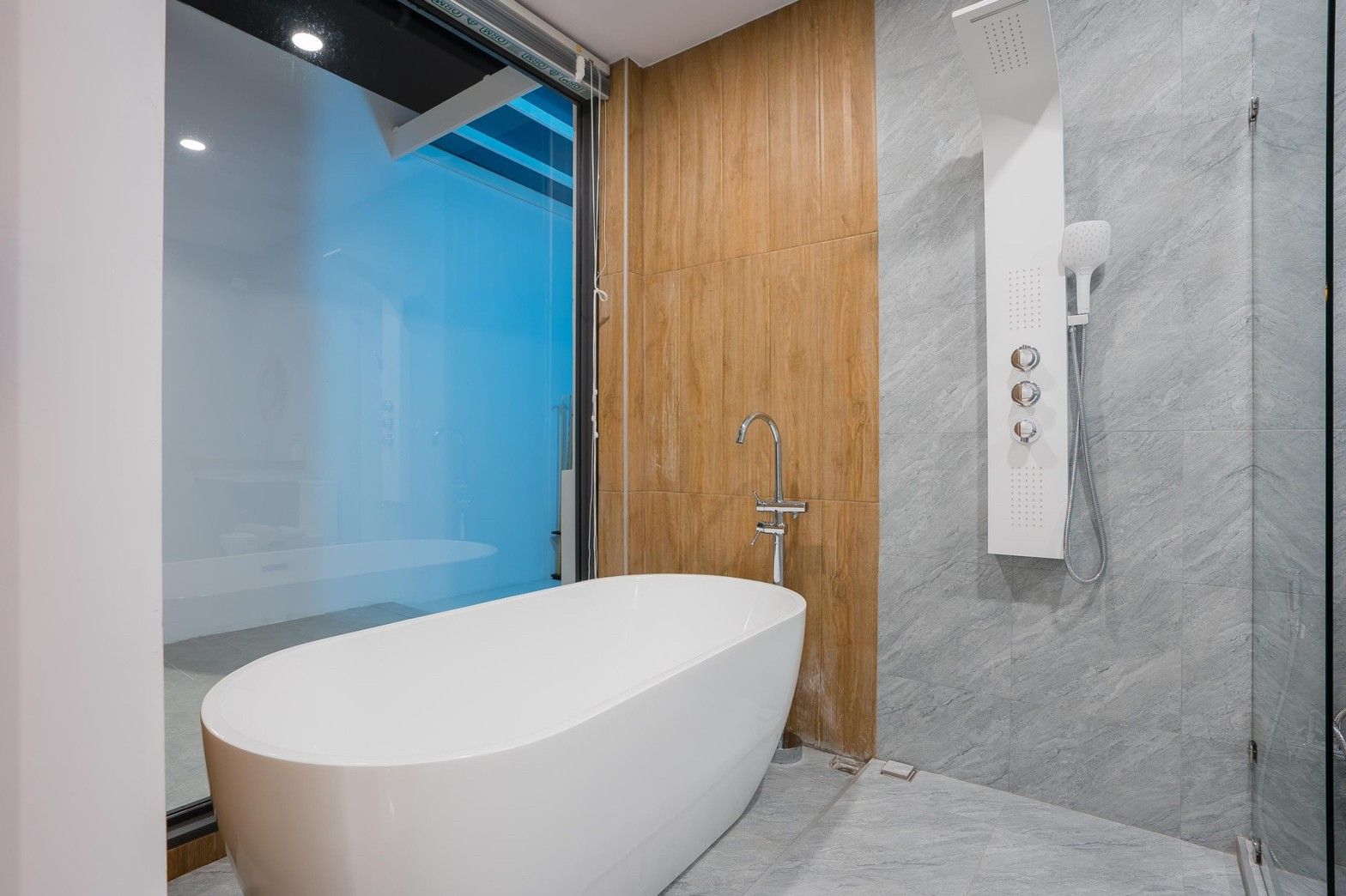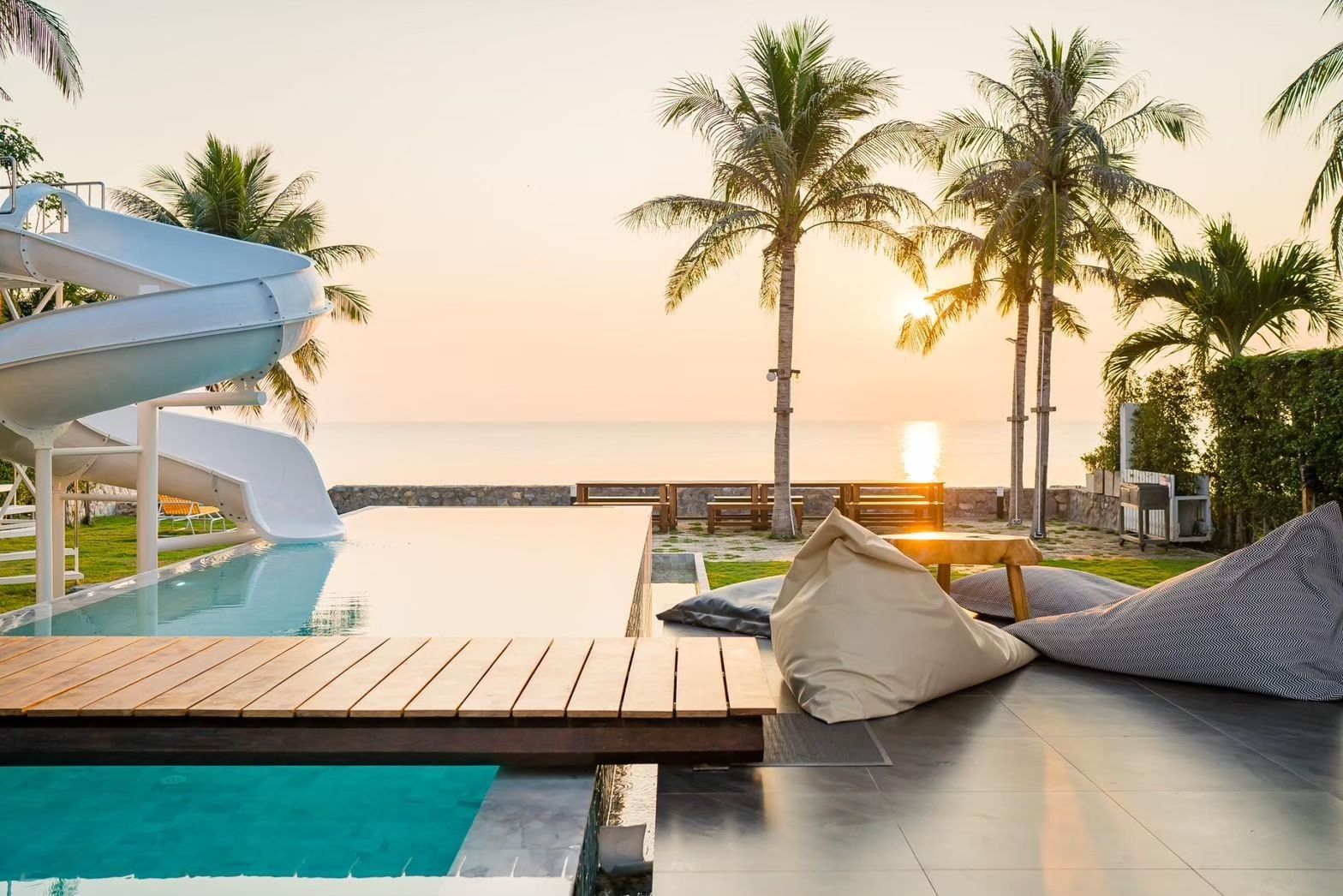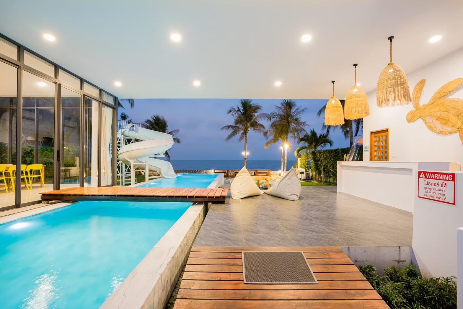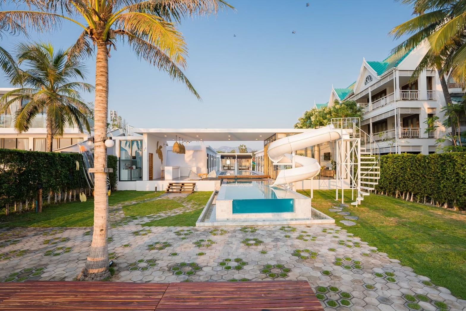 30-metre saltwater pool, acrylic wall, spiral slide. Pet-friendly Cha-Am.