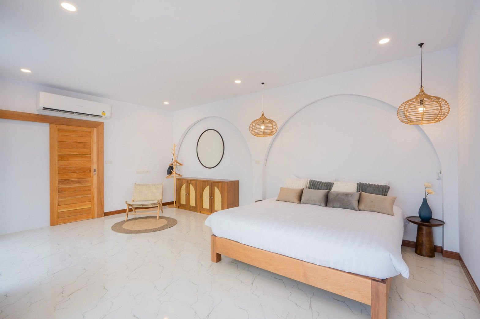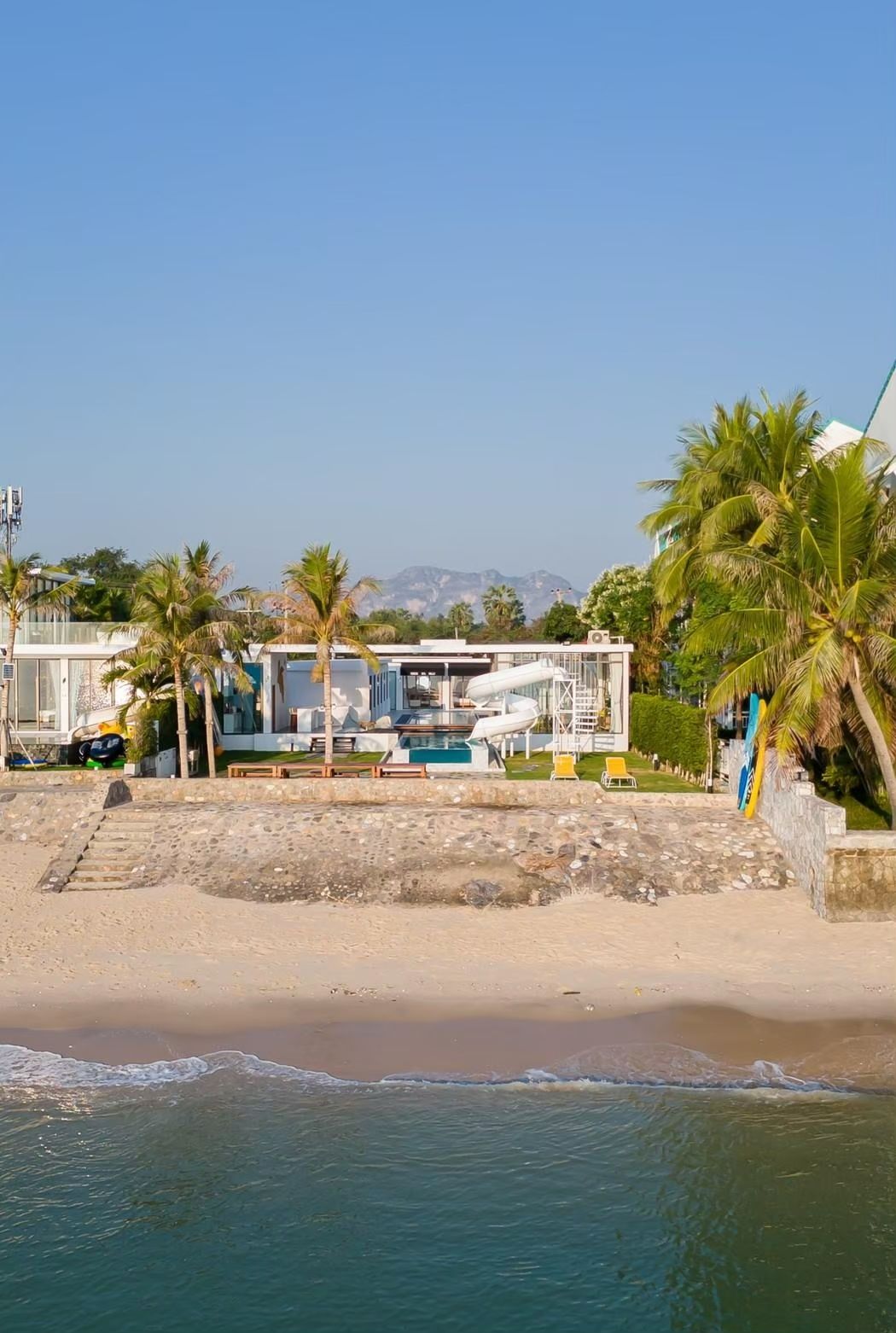 A striking white modern villa near Cha-Am where every bedroom opens directly to a 30-metre saltwater pool. The clear acrylic pool wall creates one of the most photogenic shots on Thailand's Gulf coast, complemented by a giant spiral water slide with sea views. Cross Sea VII sleeps up to 30 guests across 7 bedrooms and 7 bathrooms, each with a king or queen bed arrangement. Facilities include karaoke, a pool table, a fully equipped kitchen, BBQ grill, two 100-litre ice buckets, and free Wi-Fi. Small pets are welcome.