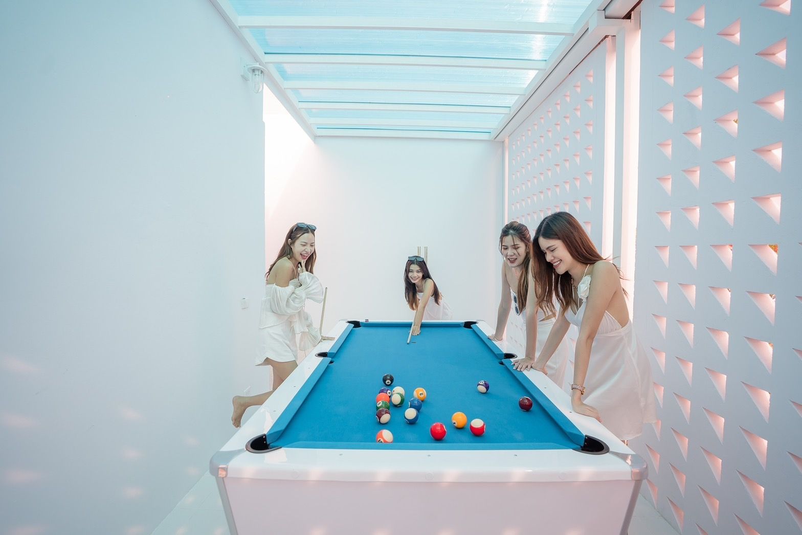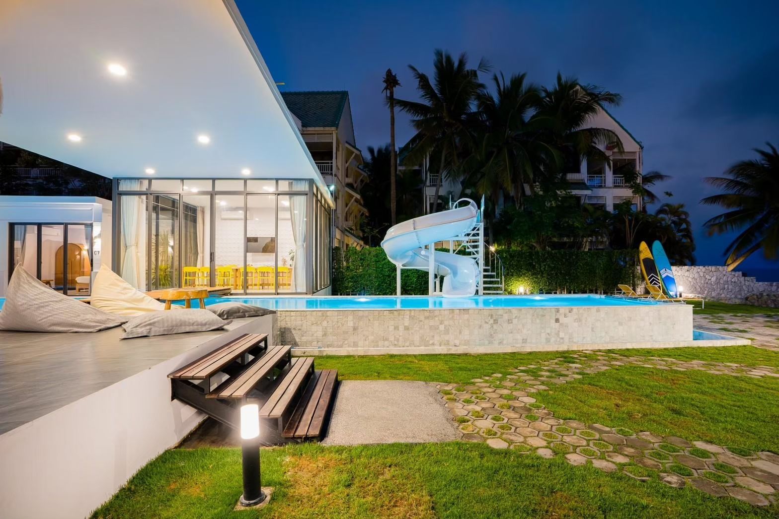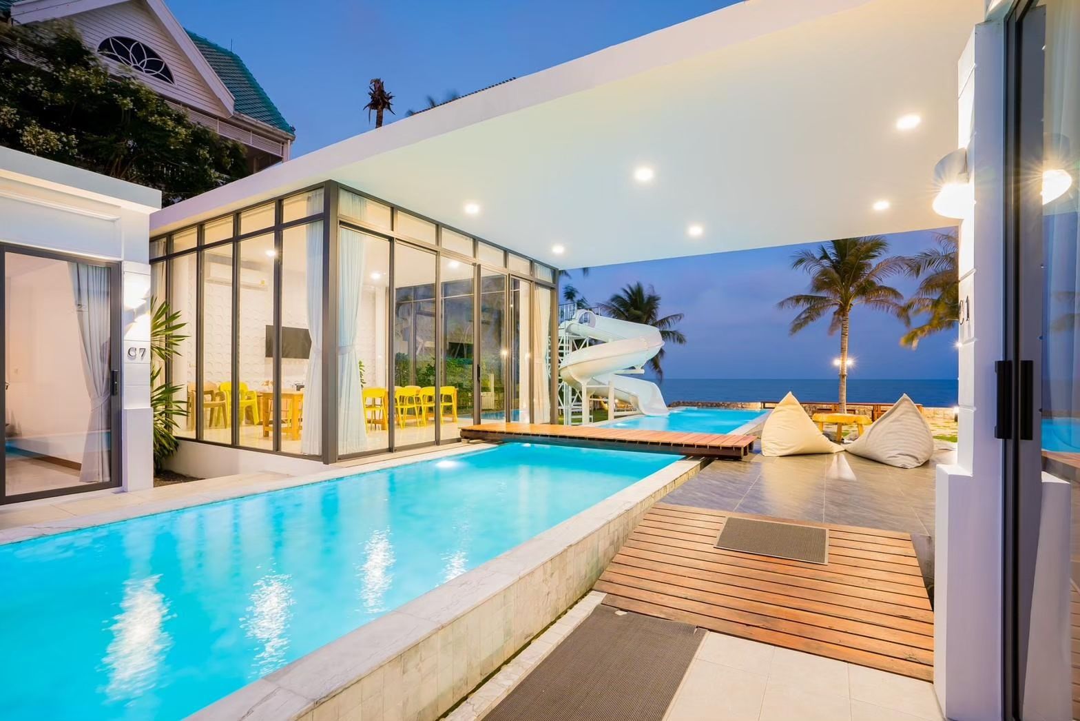 Cross Sea VII Pool Villa fits up to 30 guests across 7 bedrooms. The villa has karaoke, BBQ grill, pool table, water slide for entertainment. Events and gatherings need prior approval. Contact us on LINE to discuss your plans.