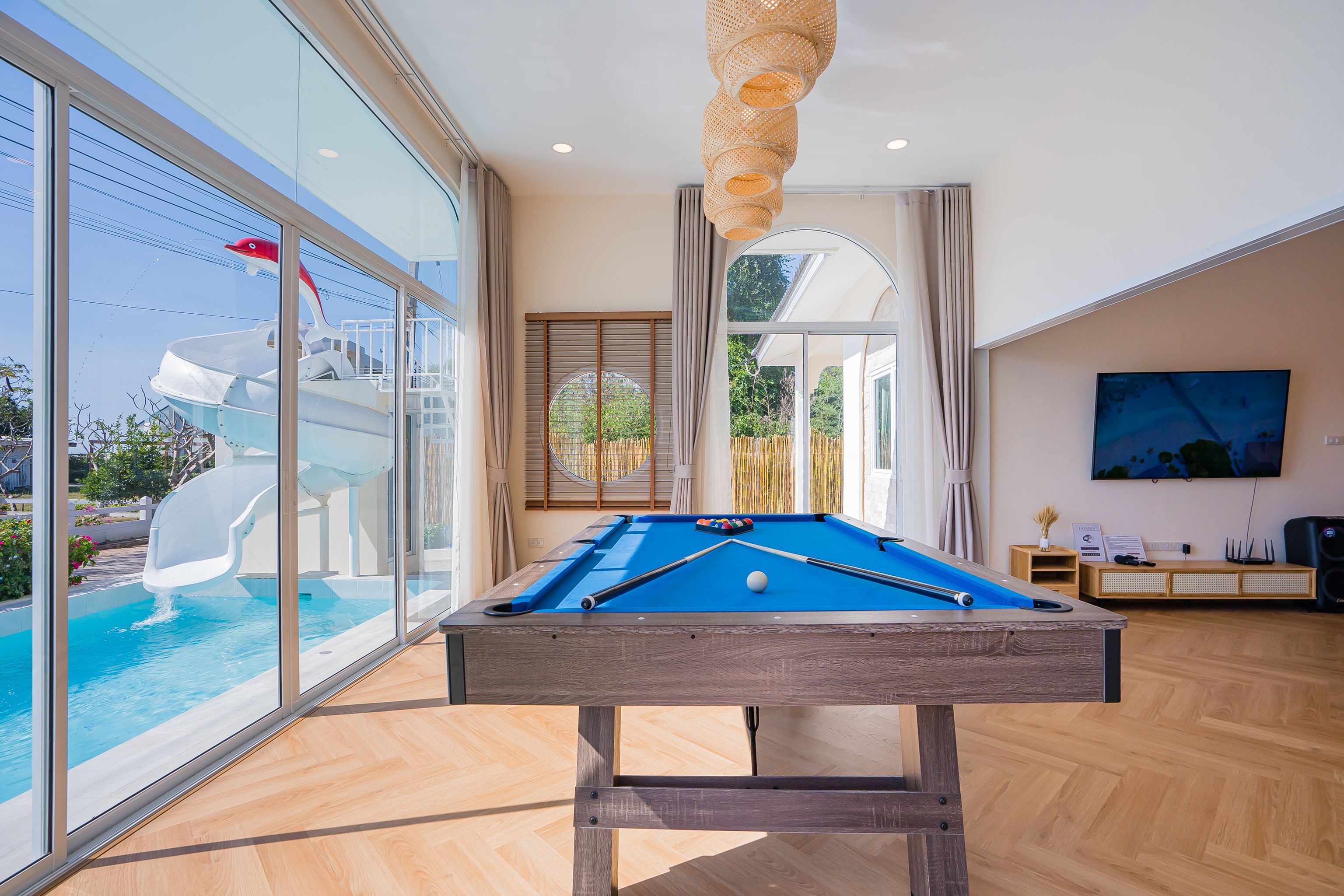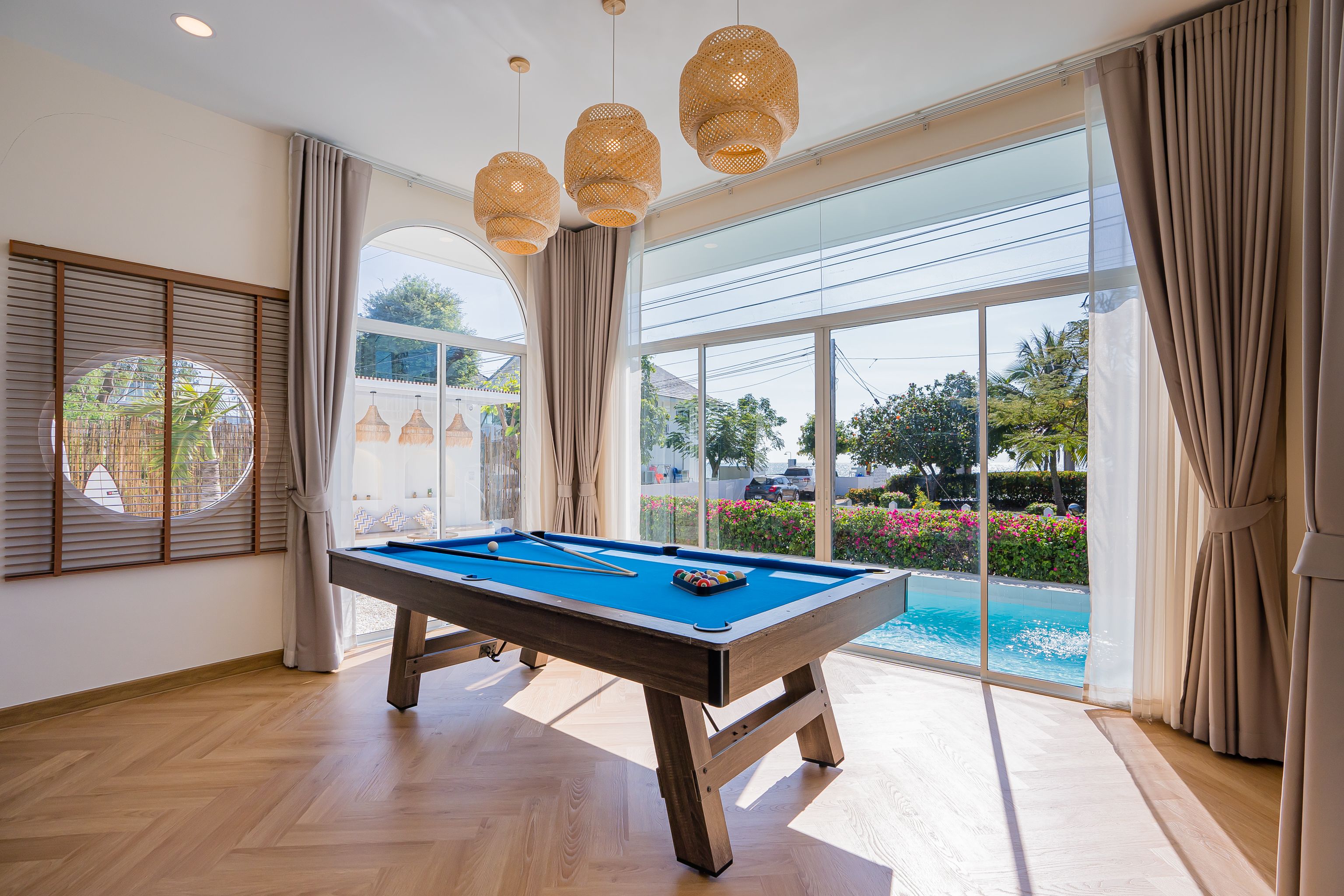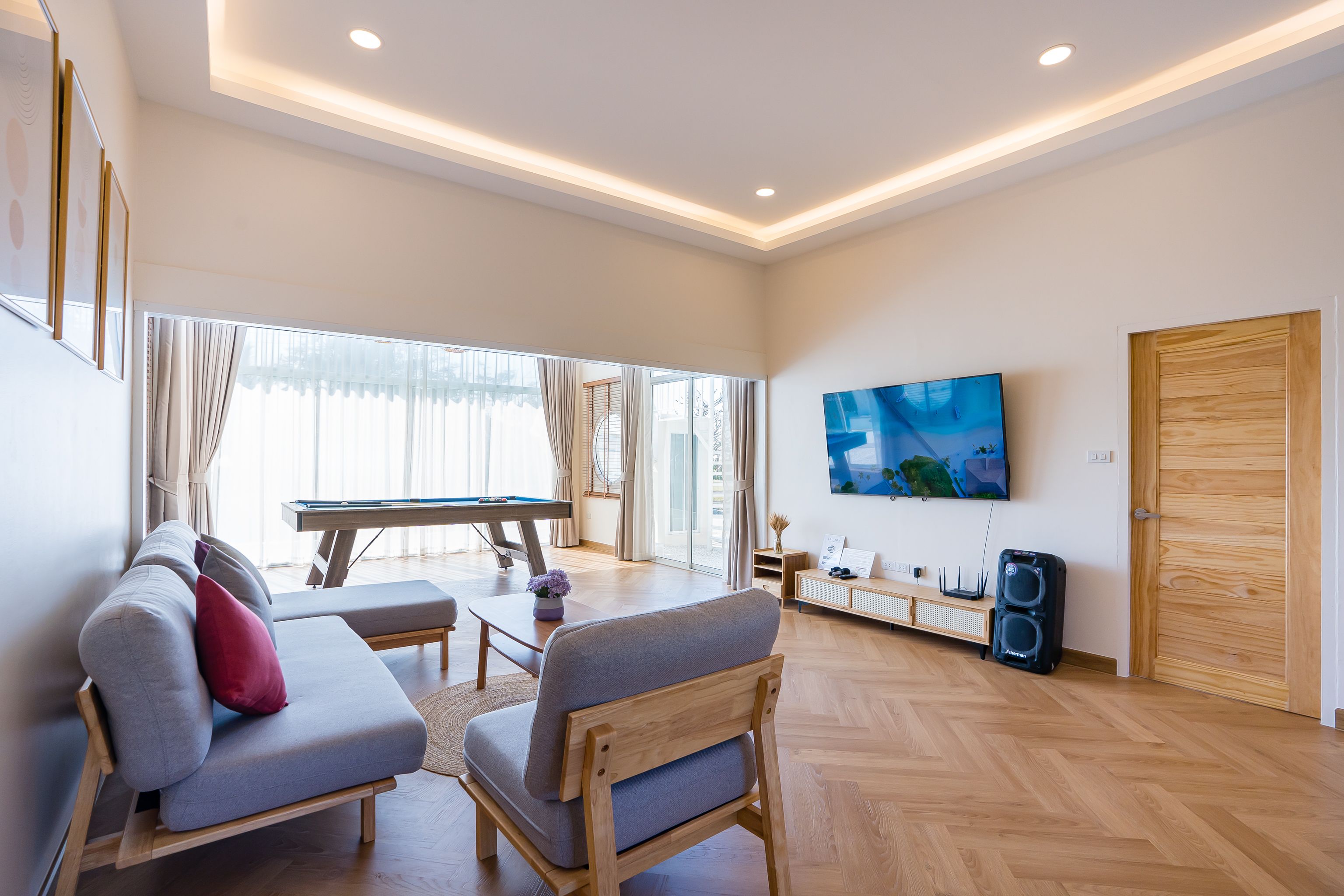 Lagoon Beach V Pool Villa fits up to 16 guests across 5 bedrooms. The villa has karaoke, BBQ grill for entertainment. Events and gatherings need prior approval. Contact us on LINE to discuss your plans.