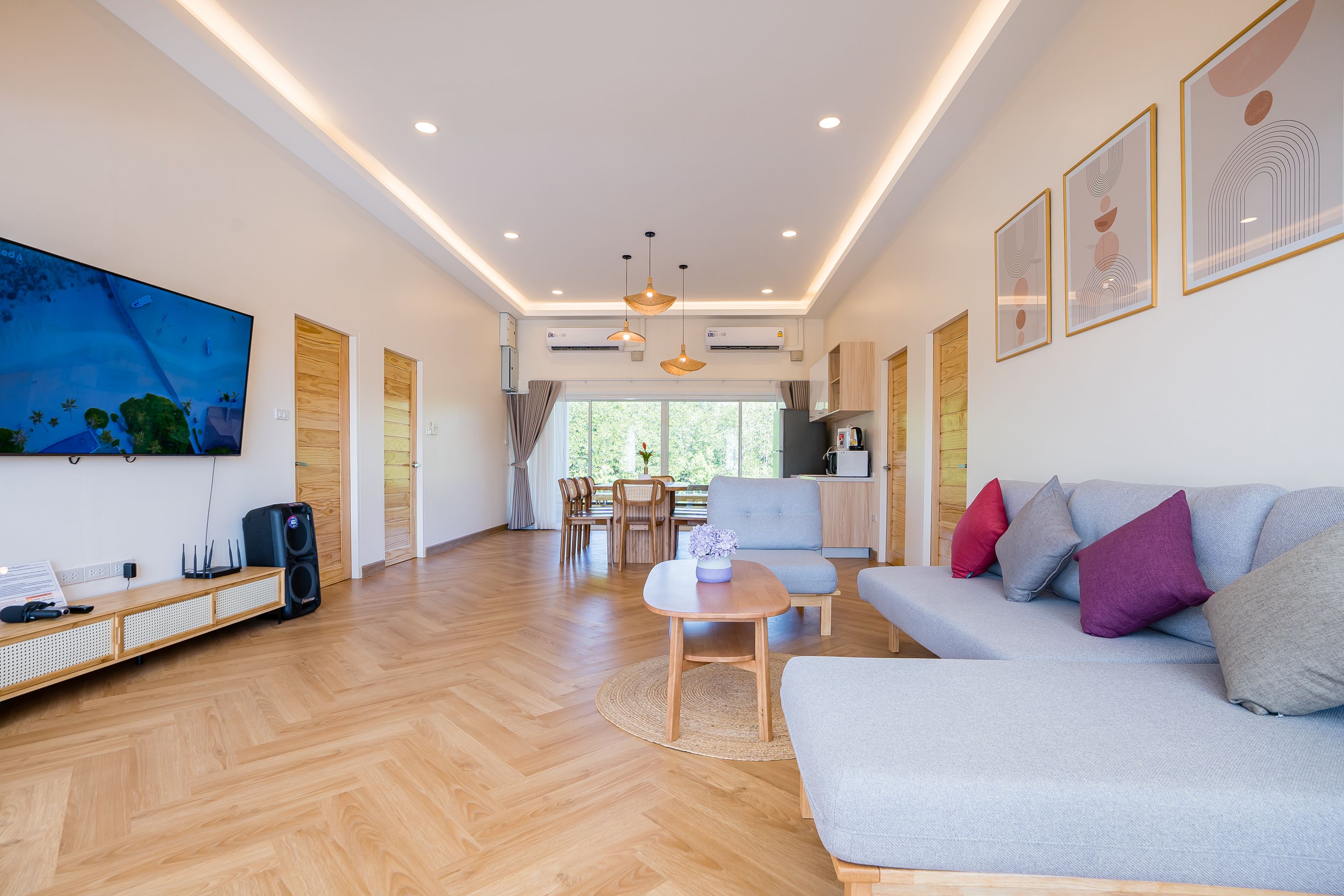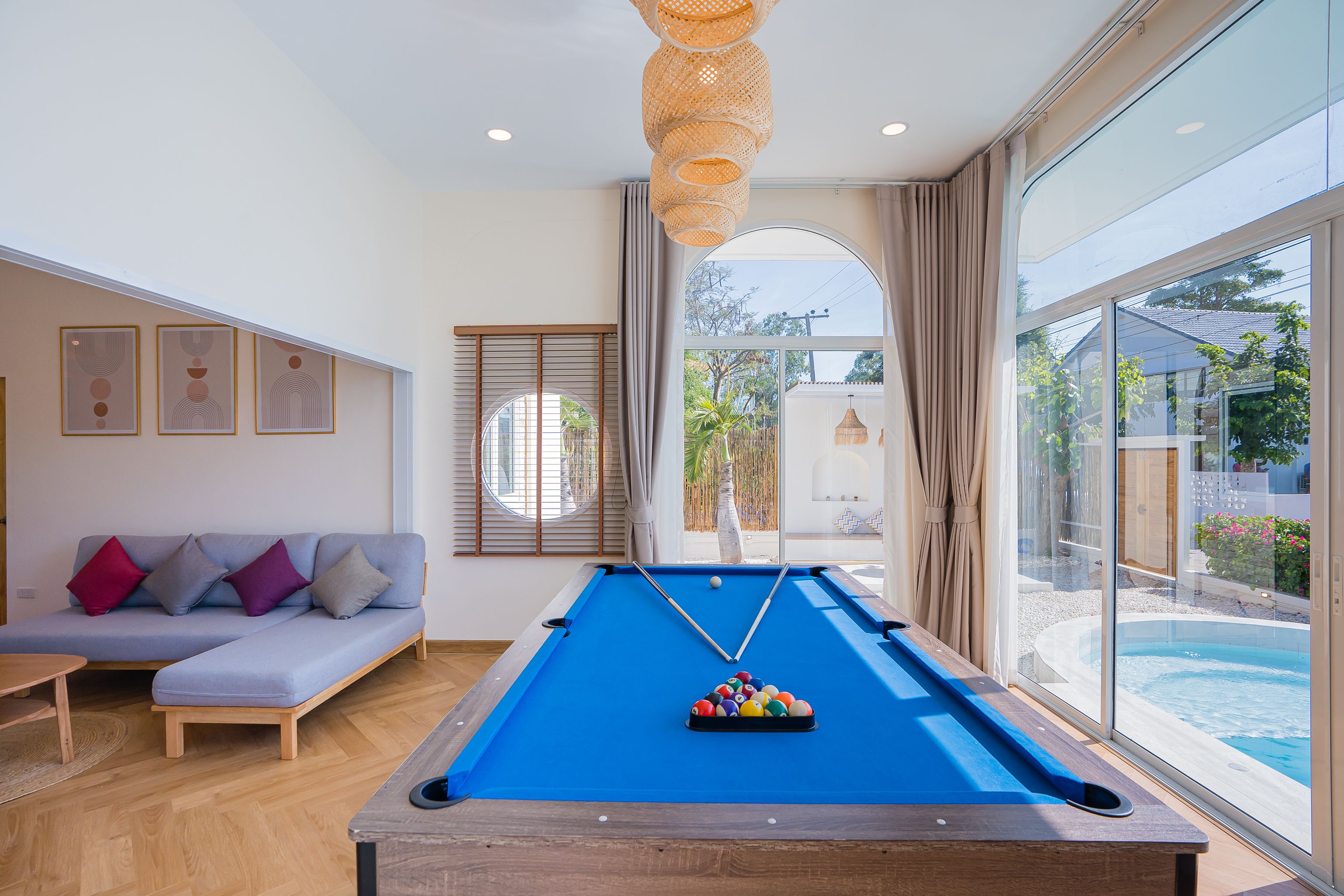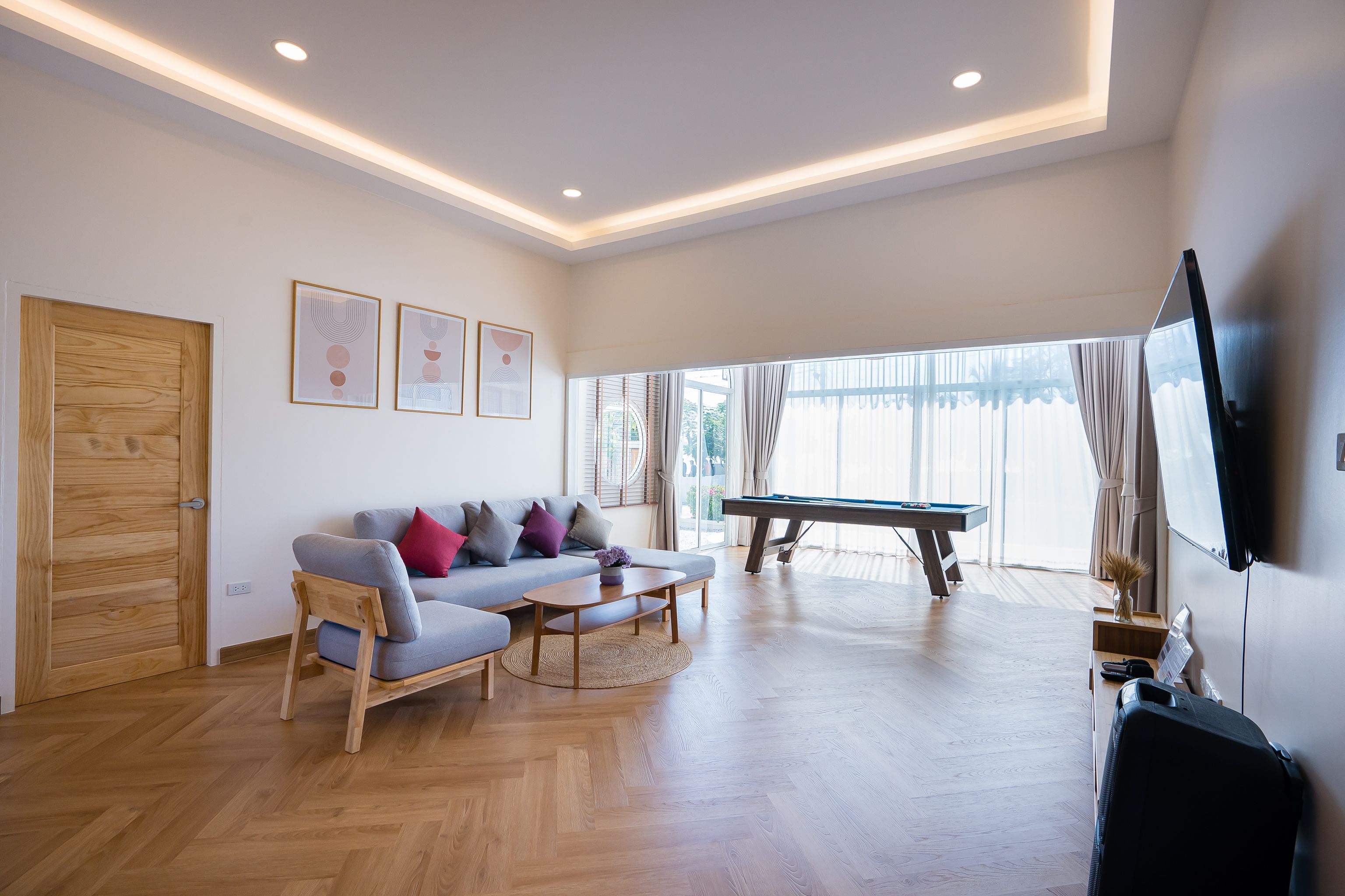 Lagoon Beach V Pool Villa fits up to 16 guests across 5 bedrooms. The villa has karaoke, BBQ grill for entertainment. Events and gatherings need prior approval. Contact us on LINE to discuss your plans.