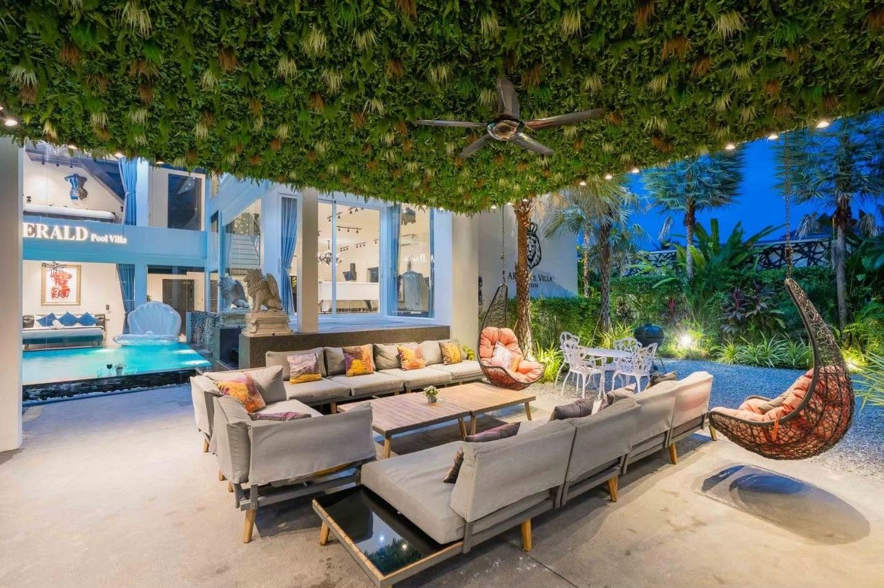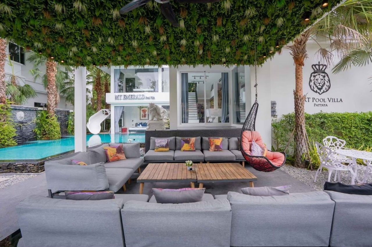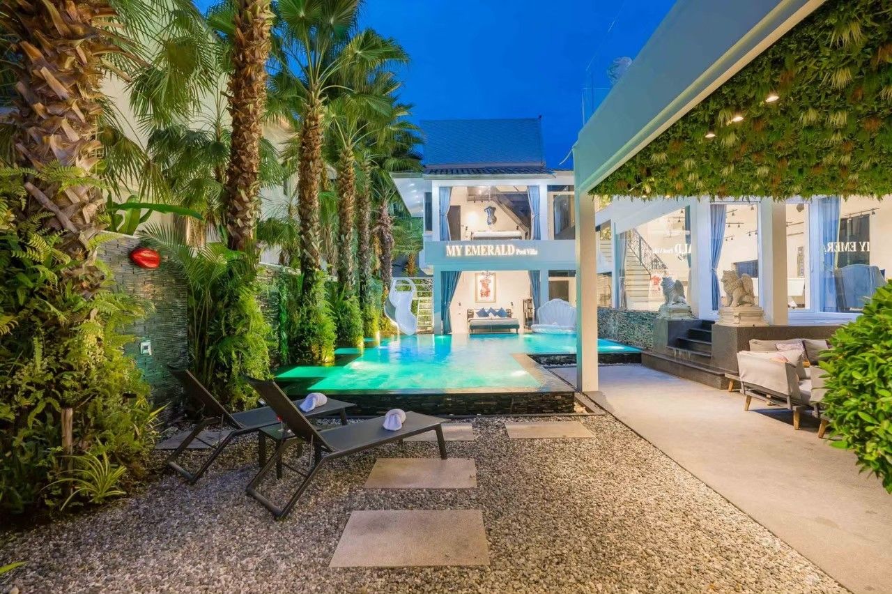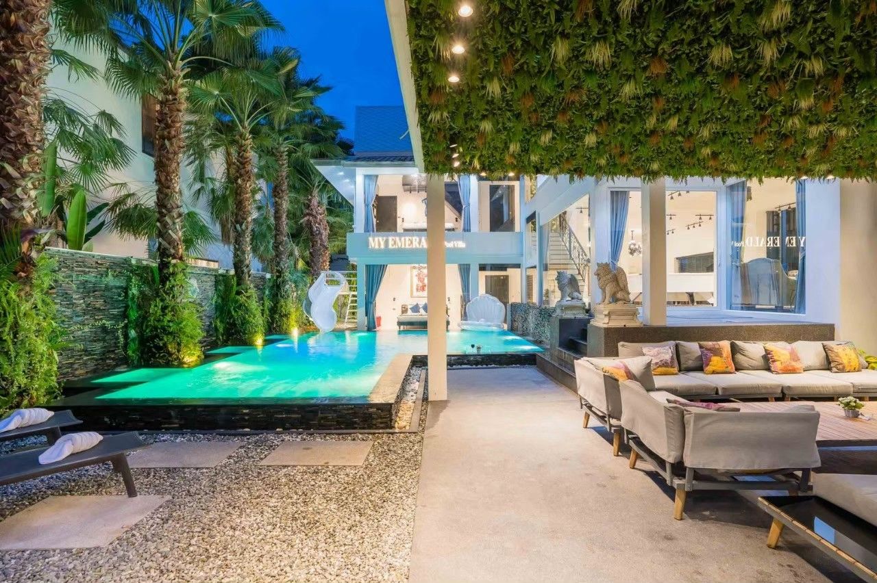 Emerald VII Pool Villa fits up to 24 guests across 7 bedrooms. The villa has karaoke, BBQ grill, pool table, water slide for entertainment. Events and gatherings need prior approval. Contact us on LINE to discuss your plans.