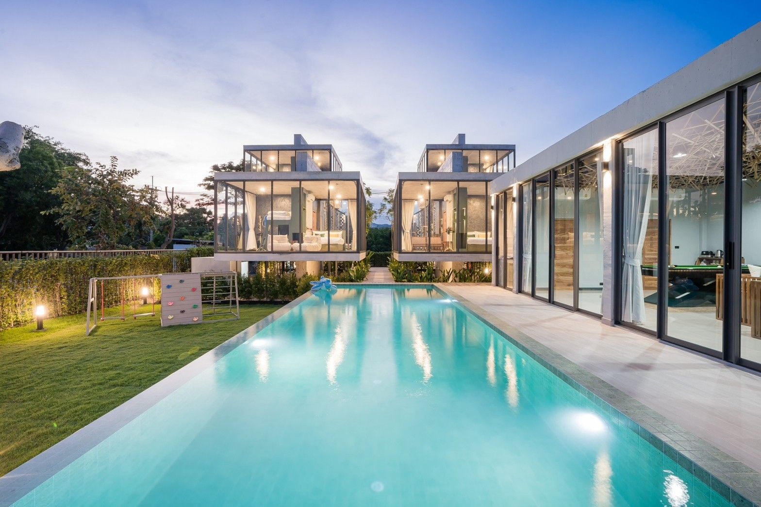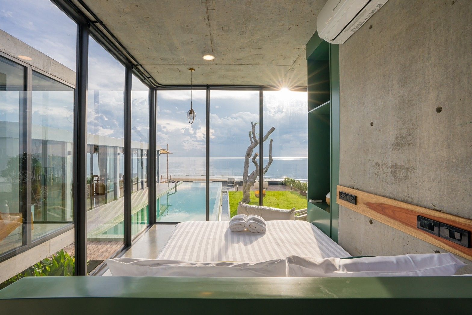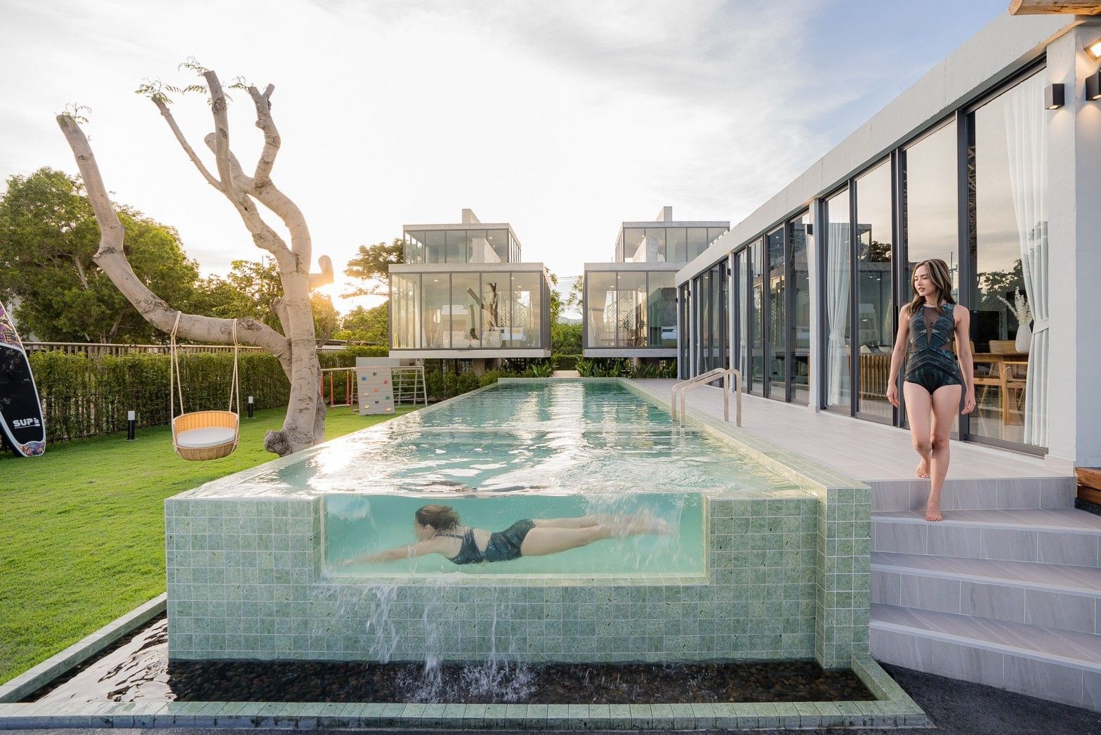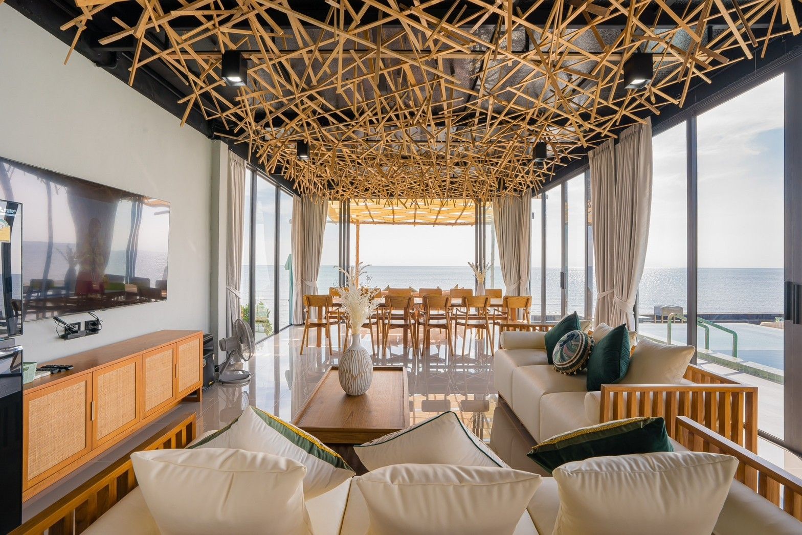 A brand-new beachfront pool villa with direct private beach access and an oversized acrylic-walled pool that makes the sea look like it flows right in. Every bedroom faces the ocean, while the panoramic 180° glass living room dissolves the boundary between indoors and outside. Four bedrooms and five ensuite bathrooms accommodate up to 20 guests, with a full kitchen, karaoke, pool table, BBQ, and Smart TV 85-inch all included. Small pets welcome, parking for up to 7 cars on-site.