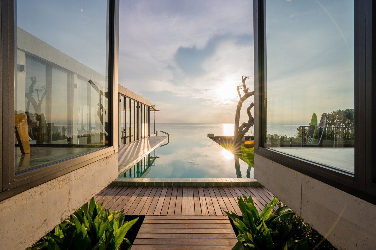 Acrylic pool wall, 180° sea view, paddle boards included.